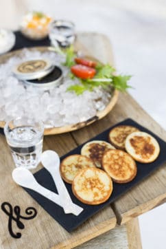 Den Kaviar servieren wir mit Crème fraîche, Brot, Ei und einem Grüll Kaviar Vodka Shot